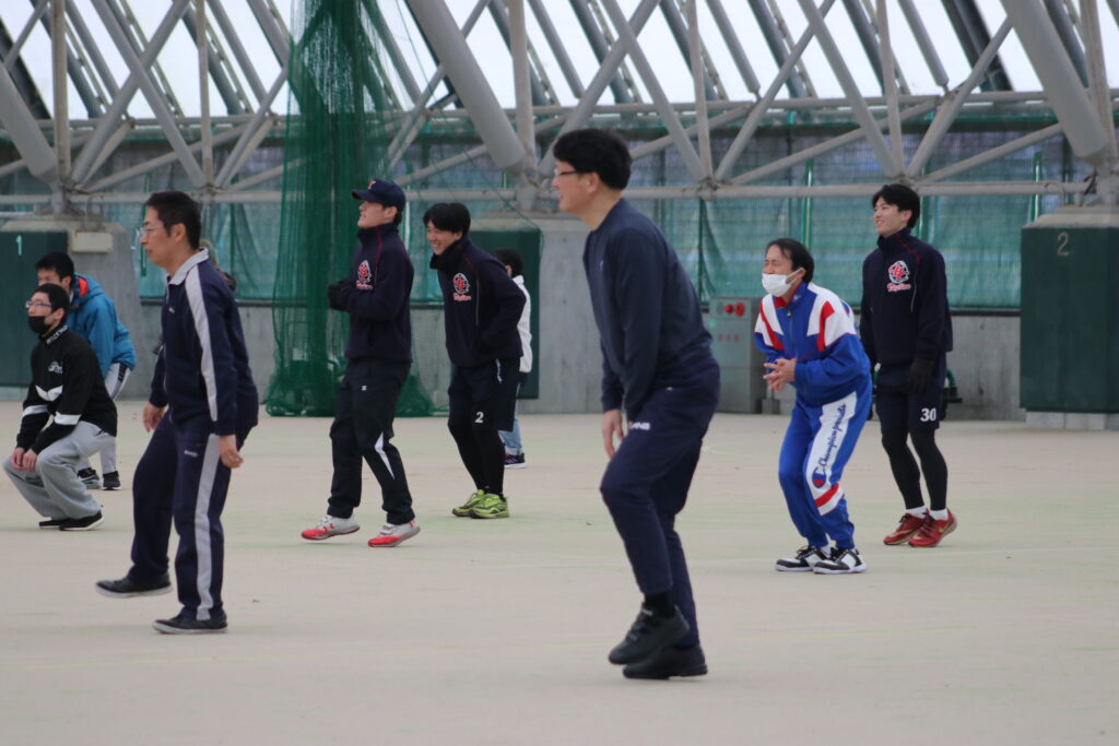 まずはウォーミングアップとして軽く1周ランニングし、体をほぐす準備運動。
